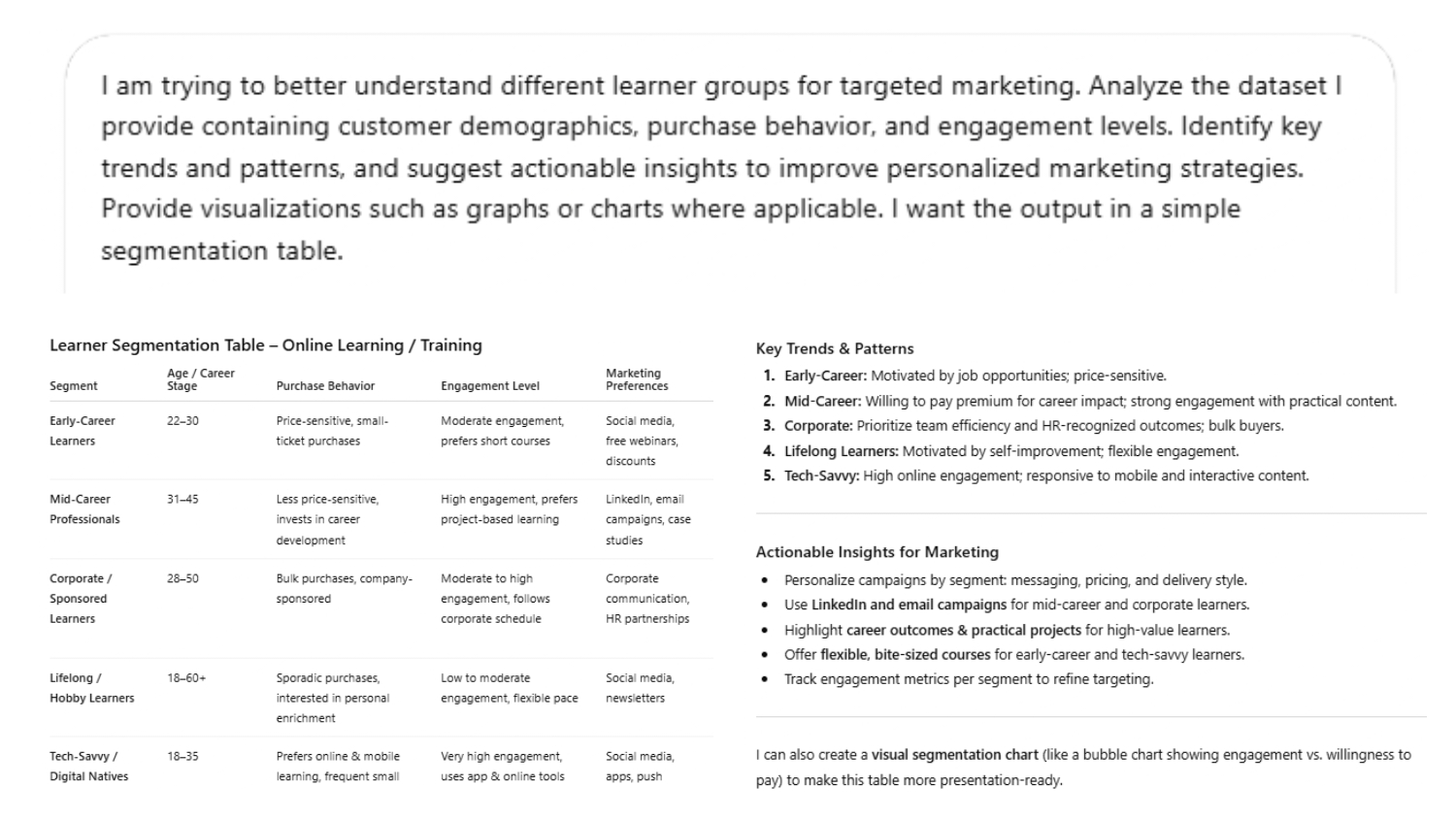 Slide titled “Market Research Analysis” showing a sample AI prompt and summarized output, including market overview, demand signals, and target customer segments such as early career professionals, mid-career professionals, and corporate learners with their key traits.