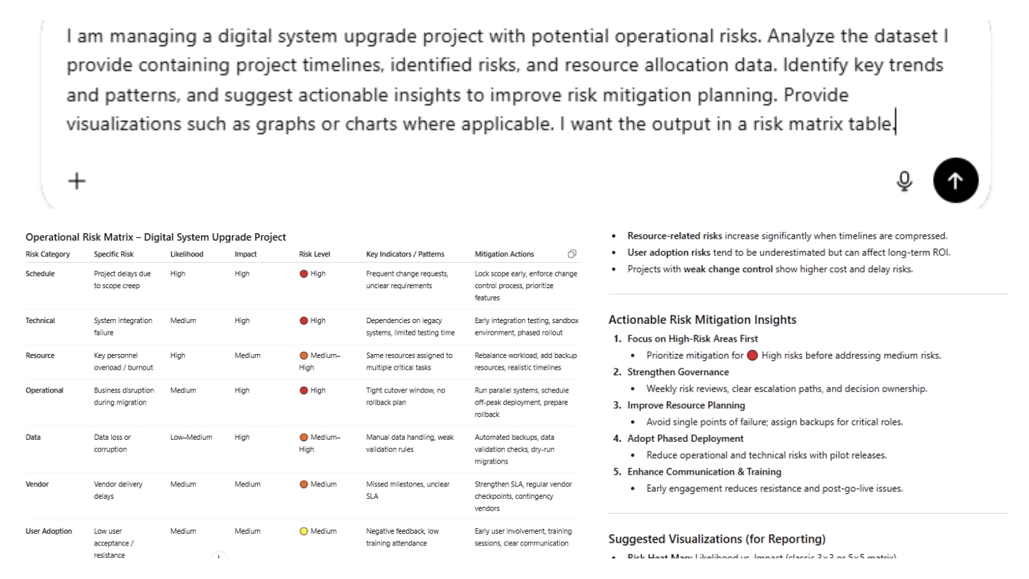 I am [describe the project]. Conduct a risk analysis by identifying potential risks, their likelihood, and impact. Propose mitigation strategies and categorize risks as high, medium, or low. Create a risk matrix for visualization.